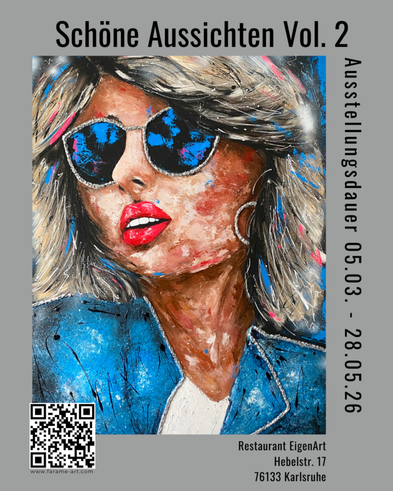 Meine aktuelle Ausstellung „Schöne Aussichten Vol. 2″ ist noch bis zum 28. Mai 2026 im Restaurant EigenArt in Karlsruhe zu sehen.